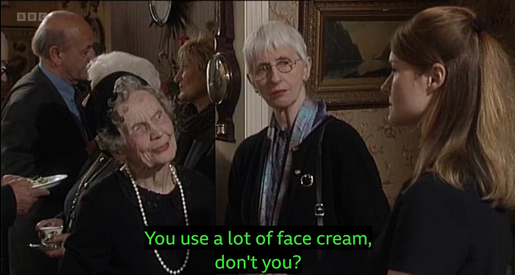 The humor elements throughout are well done. There’s a moment where Claire realises an elderly woman is using the same pricey night cream as her. “It’s expensive stuff and promises to ward off wrinkles. I make a mental note to try a different brand,” Claire thinks. This reminded me so much of the Coupling episode “Sex, Death & Nudity,” where Sally, the beautician terrified of aging, finds herself at a funeral and gets into a hilarious confrontation with an older woman who tells her, “You use a lot of face cream, don’t you? So did I,” leaving Sally horrified. That kind of dry, dark humor is woven perfectly throughout the book.